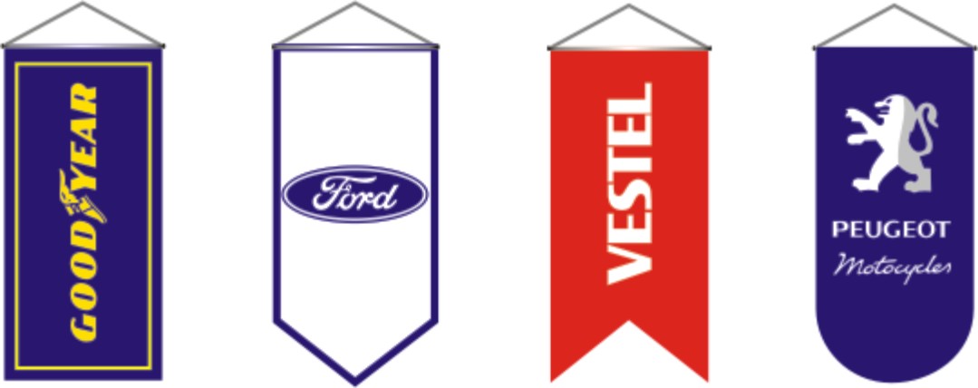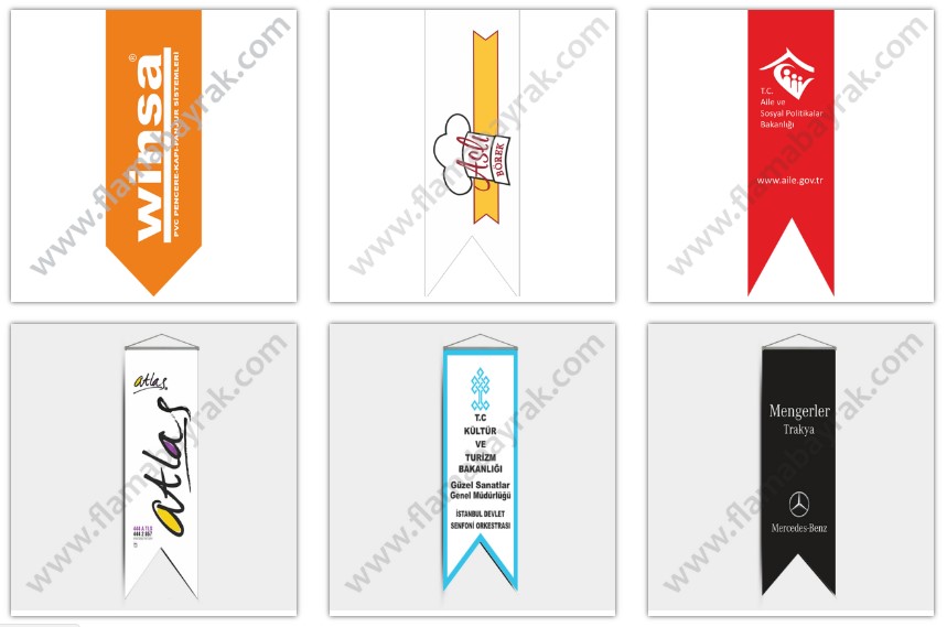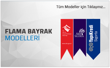 Flama ve üçgen bayrak olarak hazırlanan bu kategorideki modeller kalitesi ile amacına başarılı bir şekilde hizmetler etmektedir. İstenilen ebatlarda ve renklerde üretimler yapılıyor. Amblem ve sembol grafik çalışmalarının başarılı bir şekilde yapıldığı bu tasarımlar iç ve dış mekanlarda kullanılmaktadır.