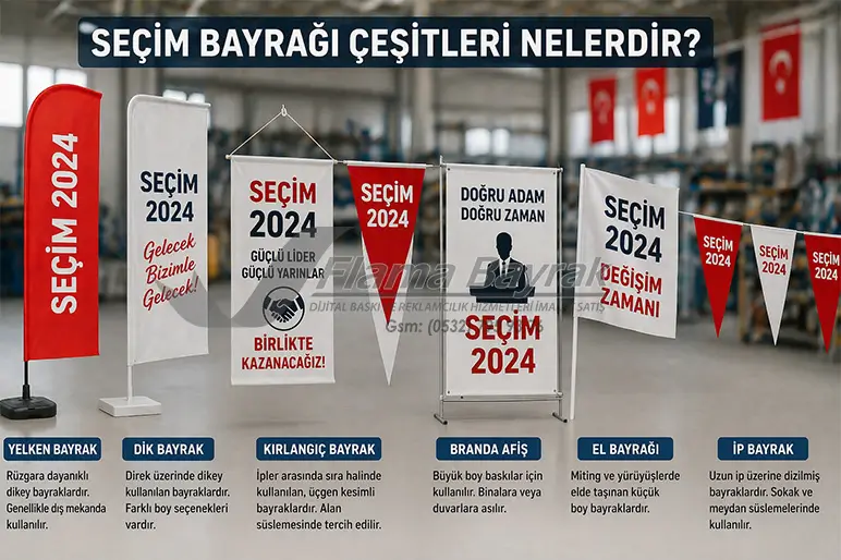 İpe Dizili Flama Bayrak Modelleri İpe dizili bayrak, siyasi partilerin, seçim zamanlarında propaganda yapabilmeleri için kullandıkları bir tanıtım şeklidir.