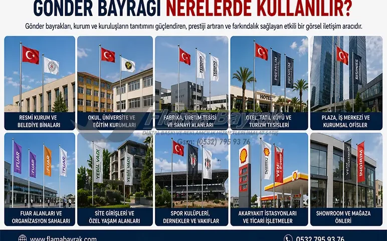 Özellikle plaza girişleri, iş merkezleri, resmi kurumlar, okul binaları ve fabrika önlerinde gönder bayrağı kurumsal ciddiyet hissi oluşturur.